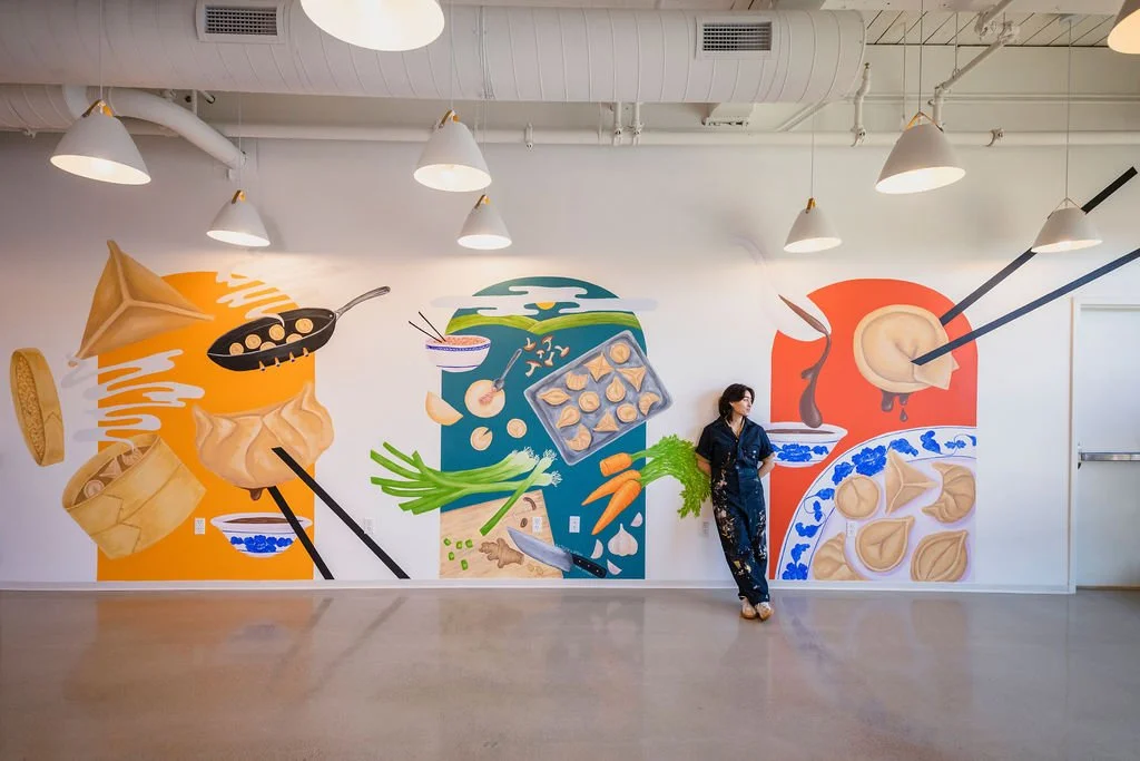 Each arch represents a different step in making dumplings. The middle arch shows farm fresh ingredients getting folded into dumplings. The left arch shows the cooking process. Dumplings are steamed in a bamboo steamer and pan-fried over the flames. The right arch shows plated dumplings served with a sauce, ready to eat!